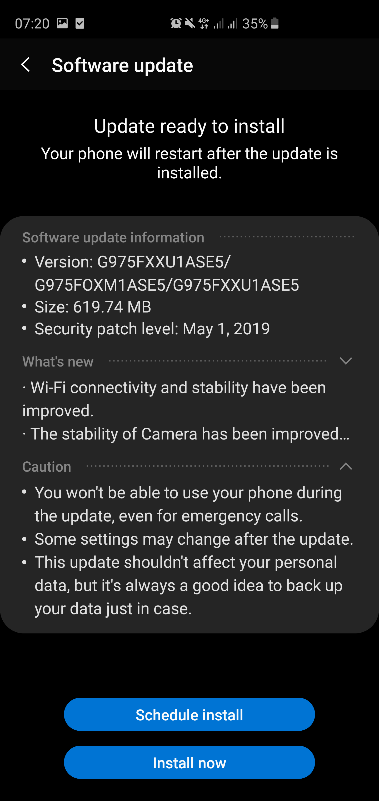 It is big in size, 619.74MB. The software versions are G970FXXU1ASE5, G973FXXU1ASE5, and G975FXXU1ASE5 for the Galaxy S10e, Galaxy S10, and Galaxy S10+ respectively.
